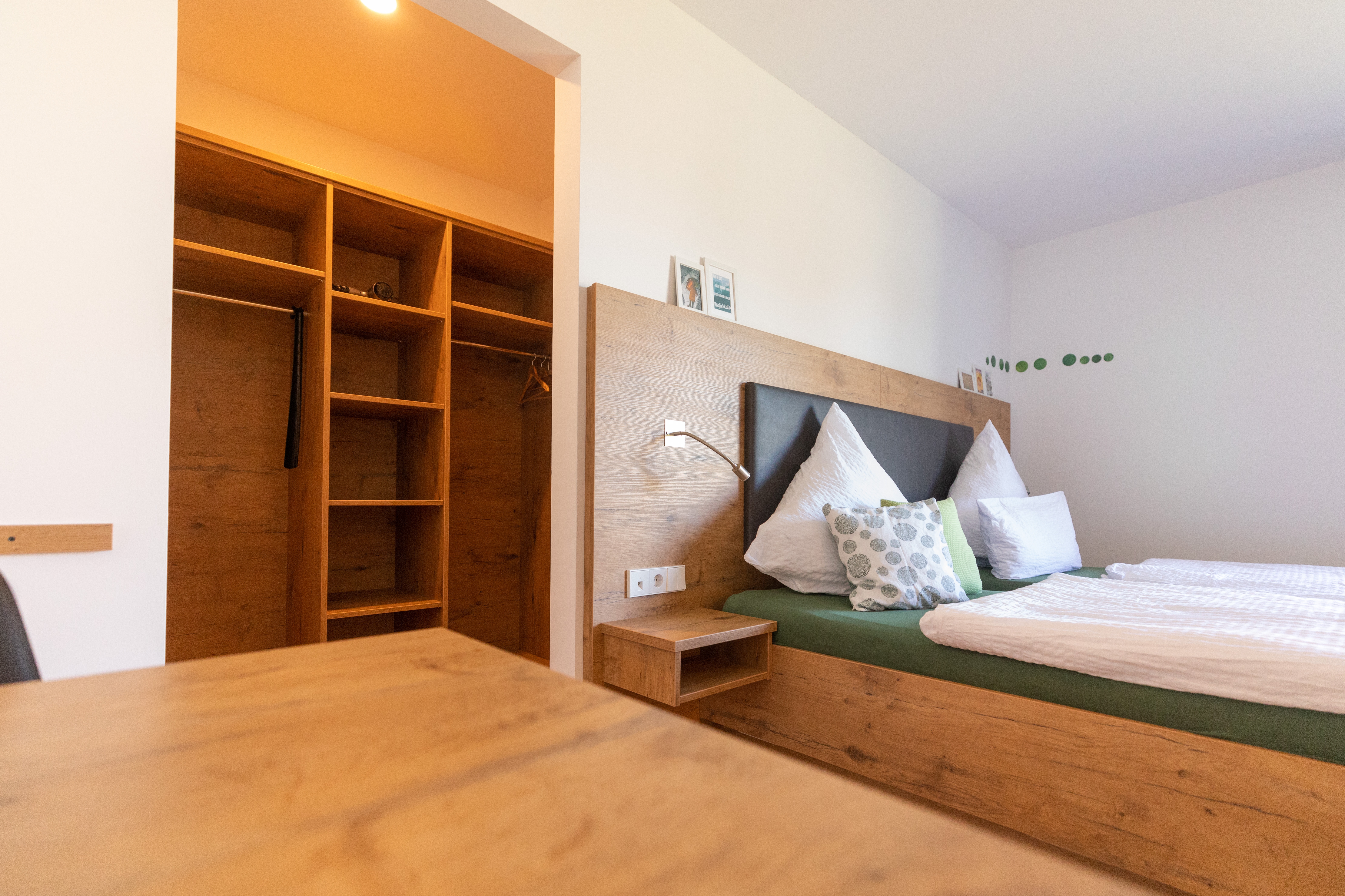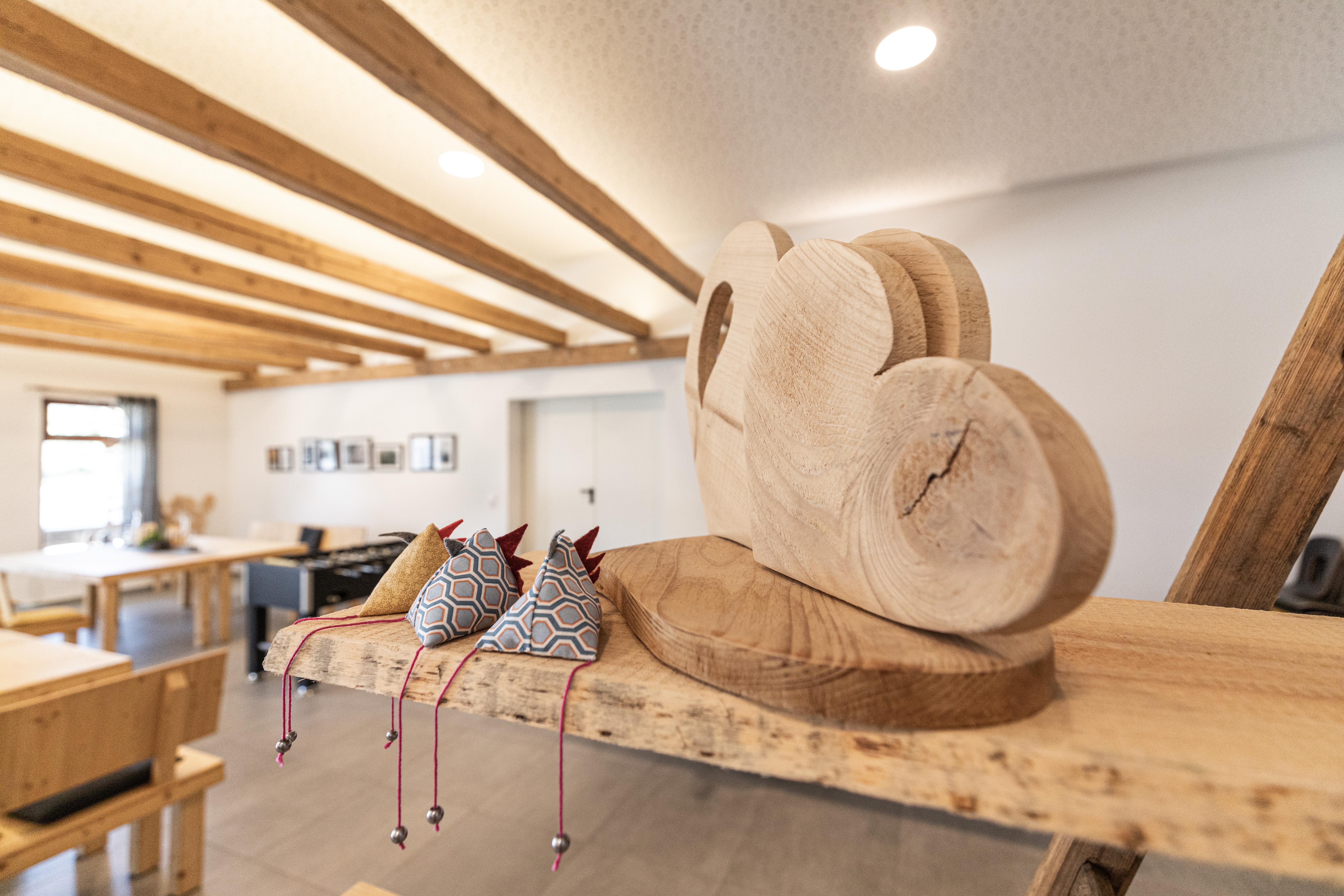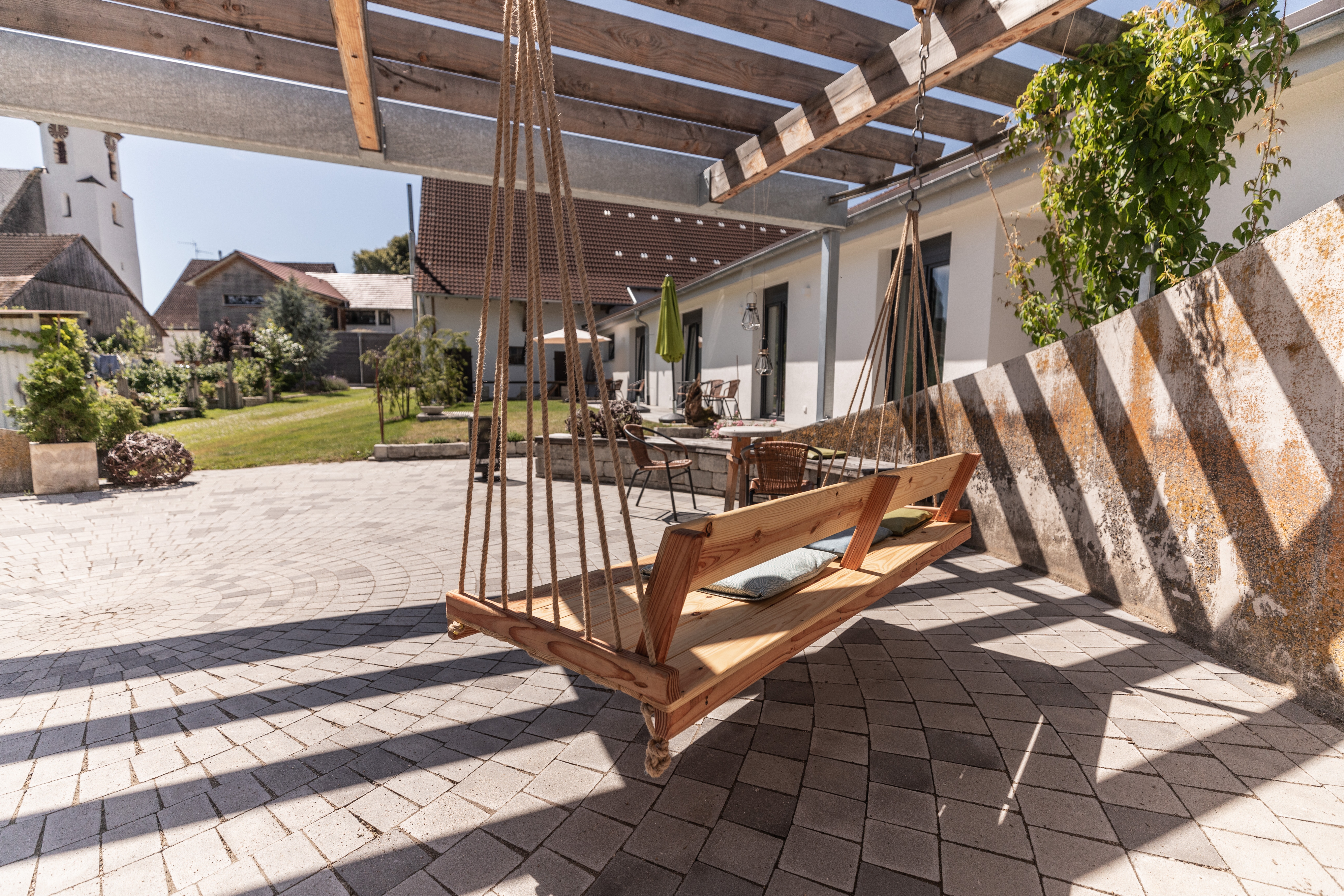 Das ursprüngliche Scheunentor ist heute markanter Eingang zu insgesamt sieben Apartments, jeweils mit Terrasse und Blick ins Grüne. Zusätzlich steht ein großzügiger Aufenthaltsraum zur Verfügung und bei schönem Wetter lädt unser einmaliger Freisitz zum Verweilen ein.