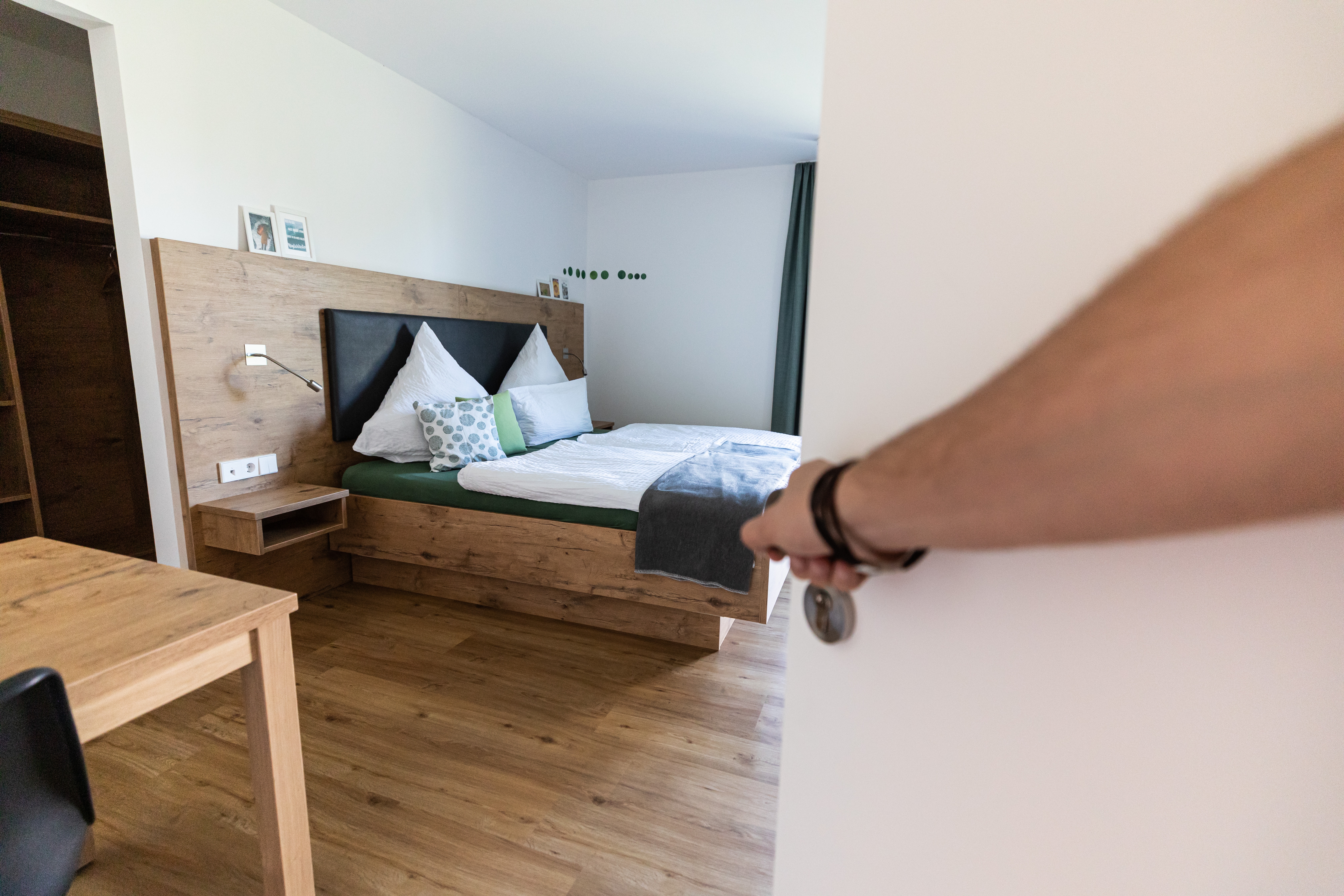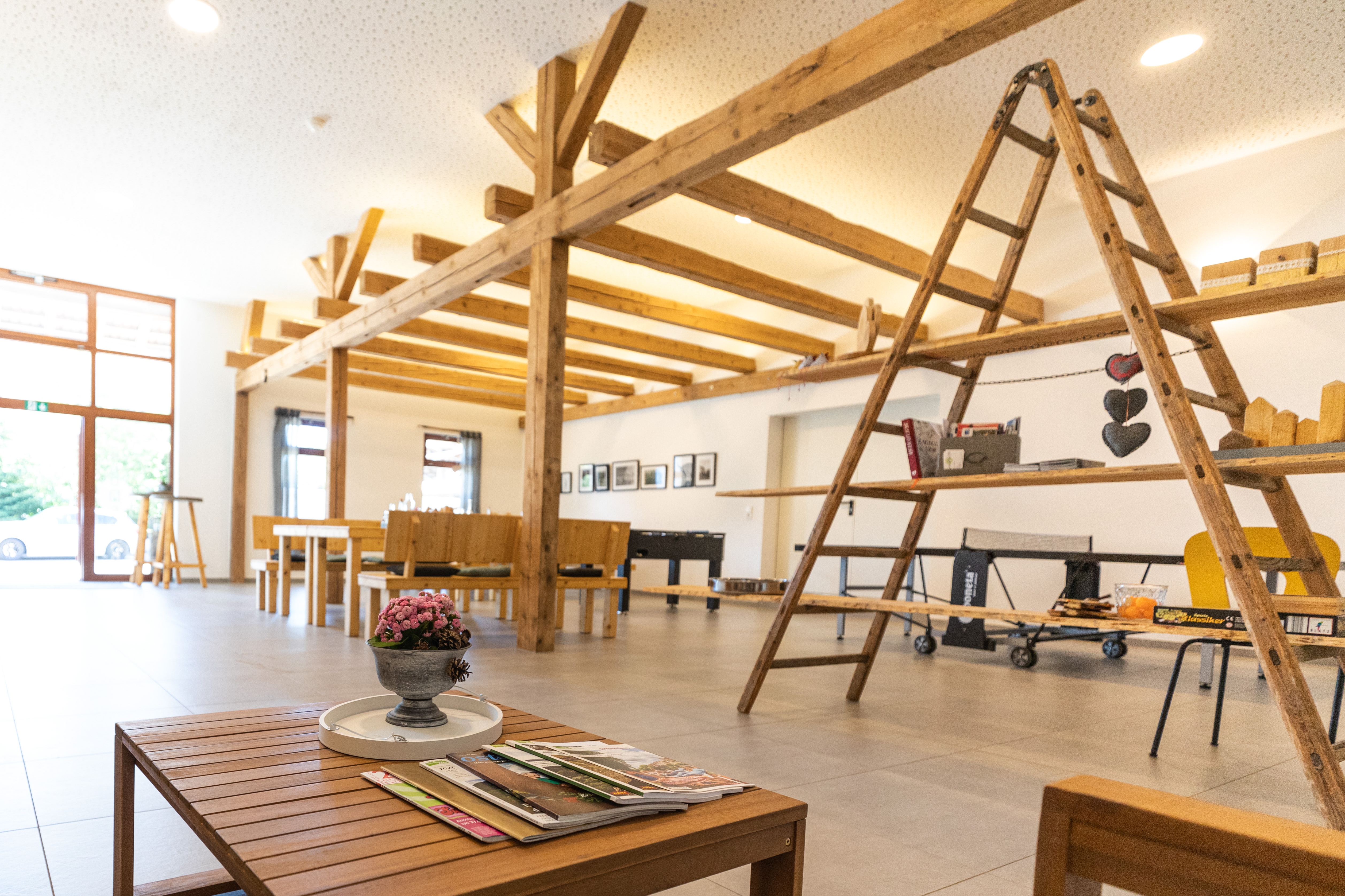 Das ursprüngliche Scheunentor ist heute markanter Eingang zu insgesamt sieben Apartments, jeweils mit Terrasse und Blick ins Grüne. Zusätzlich steht ein großzügiger Aufenthaltsraum zur Verfügung und bei schönem Wetter lädt unser einmaliger Freisitz zum Verweilen ein.